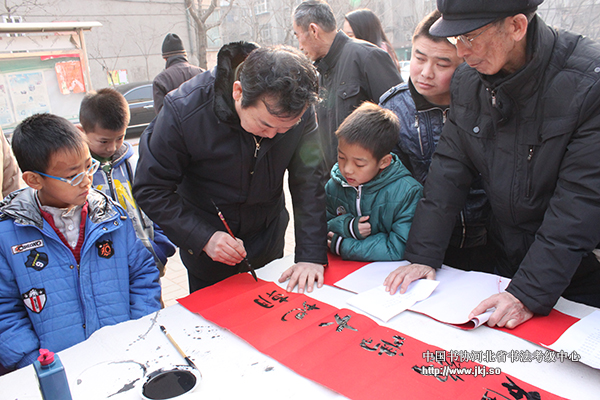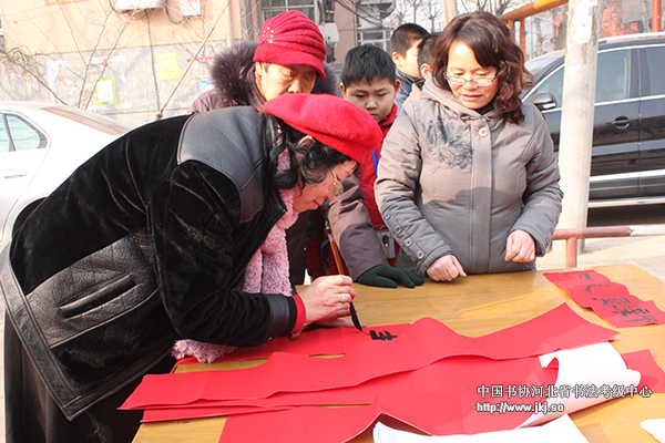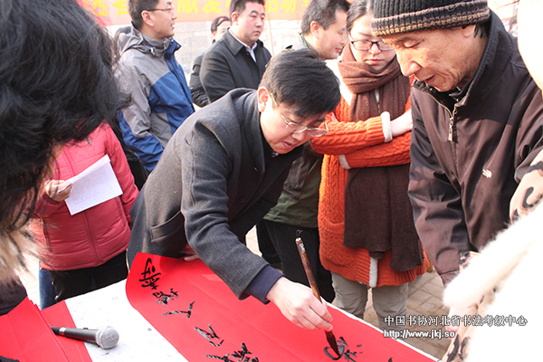 中国书协河北省书法考级中心常务主任姜贵增为居民书写春联