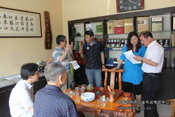 揭牌仪式前考级中心主任曹晓林,副主任姜贵增,少年素质教育报主编宋哲与工作站人员茶聊