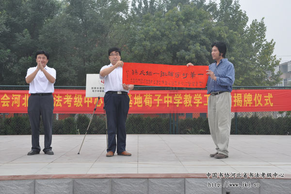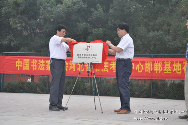 邯郸市书法考级基地主任张振彪与荀子中学校长赵奎书共同揭牌