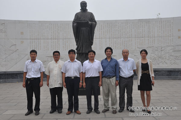 仪式后邯郸市书法考级基地主任张振彪、副主任窦江玉与荀子中学校领导班子合影留念