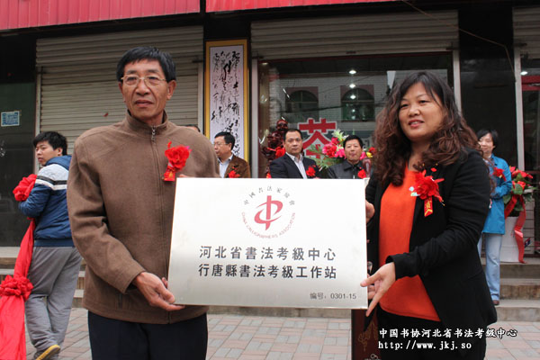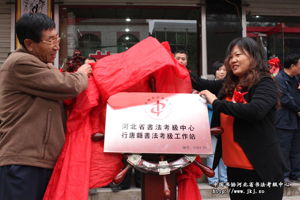 中国书协河北省书法考级中心主任曹晓林和行唐县书法考级工作站韩卫共同揭牌