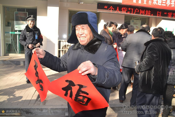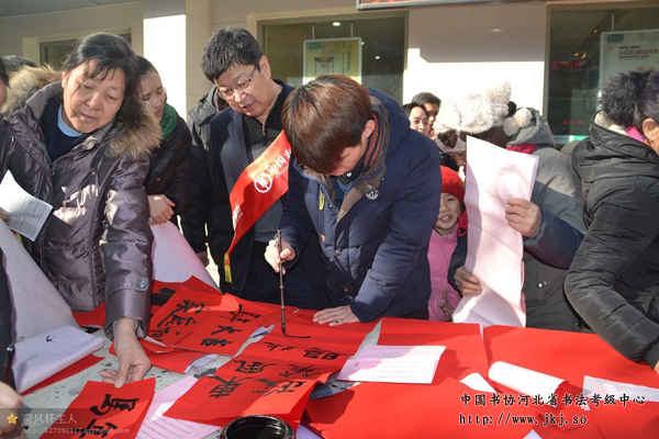 本次活动由中国书协河北省书法考级中心磁县书法考级工作站组织,磁县书法考级工作站站长李红星带领三位书法老师进行现场书写,受到了磁县群众的热烈欢迎。活动现场人头攒动,有的希望求一幅对联,有的希望写几个“福”字。有位拿到福字的老大爷高兴的说:“以前都是买现成的对联,现在是现场写出来的,从红纸黑字中感觉年味更重了,很好!”。
