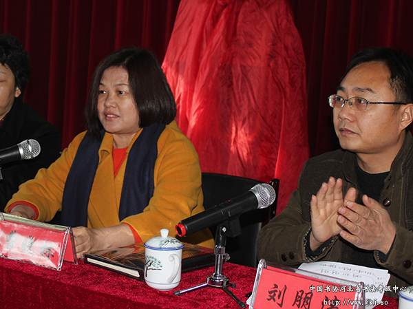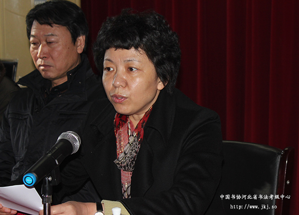 在揭牌仪式上,中国书协河北省书法考级中心主任曹晓林致辞,首先祝贺安平县书法考级工作站的成立,介绍了省书法考级中心成立以来做的主要工作,阐述了书法考级的权威性、唯一性、规范性的特点,强调了书法考级由中国书法家协会书法考级中心统一出题、统一判卷、统一发证。她还强调安平县书法考级工作站成立以后,要做好两件事:一是为全县中小学校“书法进课堂”服务,书法的传承和普及离不开教育部门,工作站要主动争取教育部门的支持,积极配合教育部门做好“书法进课堂”的服务工作。二是为全县书法爱好者服务,据了解安平县有不少书法爱好者,工作站成立以后无疑成为书法爱好者聚集的地方,工作站要成为书法爱好者的家,热情地为他们服务,让他们感受书家的温馨,把更多的书法爱好者团结在工作站的周围。
