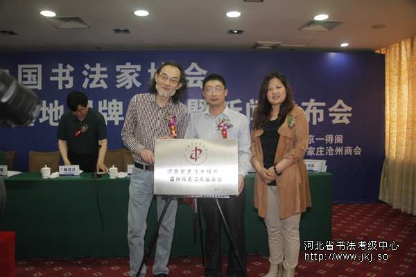 中国书法家协会书法考级中心主任崔志强先生,河北省书法考级中心主任曹晓林女士,沧州书法考级基地宋忠起先生揭牌合影
