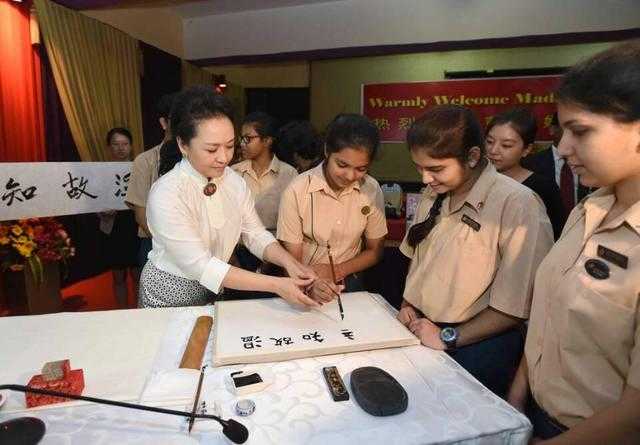 新华网北京9月18日电,习近平主席夫人彭丽媛18日上午在新德里参观泰戈尔国际学校时,用毛笔书写成语“温故知新”,并签名盖上印章。她对师生们逐字讲解后说,我们要经常温习学过的知识,不断学习掌握新知识,开拓创新,与时俱进。希望同学们认真学习,更好报效祖国,祝你们成功。