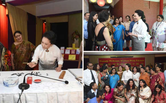 2名印度女学生用毛笔学着写“温故知新”。看了一会,彭丽媛主动上前用手握着一位女生的手,帮助矫正手腕姿势,并握笔示范:“要这样写,手动腕不动,笔要垂直。”热情示范引来一阵热烈掌声。彭丽媛笑着说,年少时就要打下良好基础,我记得5岁时父亲就教我练书法了。