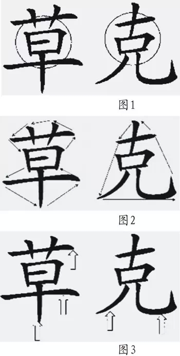 “形”指字形问题,即字的边缘连线后所成的形。汉字必定有个外形,练字者心中也应有字体外形的印象,然后主动建构相应的字形,这将对形成清晰“印象意识”有明显的促进作用。(如图2)