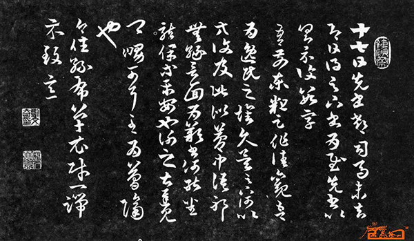 《十七帖》是王羲之今草书的代表作品。《十七帖》是称情疾书的尺牍。尺牍既是一种文体,又是一种形式,是魏晋以来文人书法的主要载体。北齐颜之推说:“真草书迹,微须留意”。江南谚云:“尺牍书疏,千里面目也”(《颜氏家训·杂艺篇》)。北宋文学家欧阳修说:“余尝喜览魏晋以来笔墨遗迹,而想前人之高致也! 所谓法帖者,其事率皆吊哀候病,叙睽离,通讯问,施于家人朋友之间,不过数行而已。盖其初非用意,而逸笔余兴,淋漓挥洒,或妍或丑,百态横生,披卷发函,灿然在目,使骤见惊绝,徐而视之,其意态如无穷尽,使后世得之,以为奇观,而想见其为人也”(《集古录跋尾》)!《十七帖》正是这样一种堪称法帖的尺牍。通篇不假修饰,结构在疾书的情状下随势生发,随机变化。技法与才情,理性与感性,自然地融为一体。