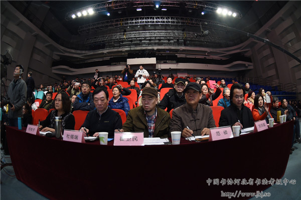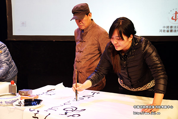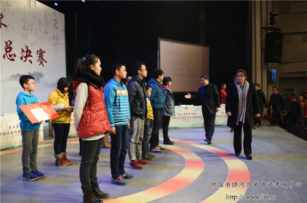 中国书协河北省书法考级中心主任曹晓林等与选手亲切握手