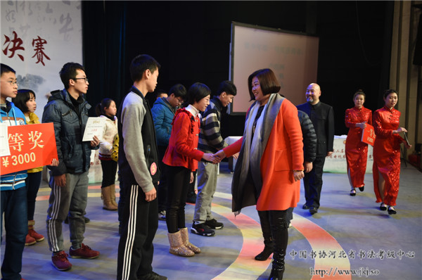 吉林省书法考级中心主任王嘉璐(前一)、石家庄文化产业协会会长田炳建(第二)等嘉宾为选手颁奖