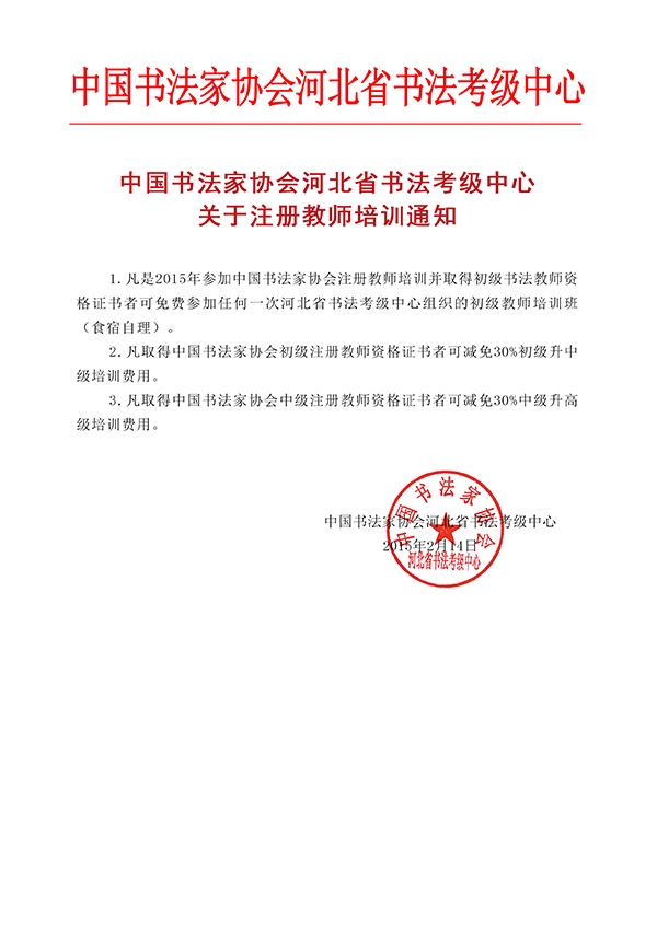 1.凡是2015年参加中国书法家协会注册教师培训并取得初级书法教师资格证书者可免费参加任何一次河北省书法考级中心组织的初级教师培训班(食宿自理)。