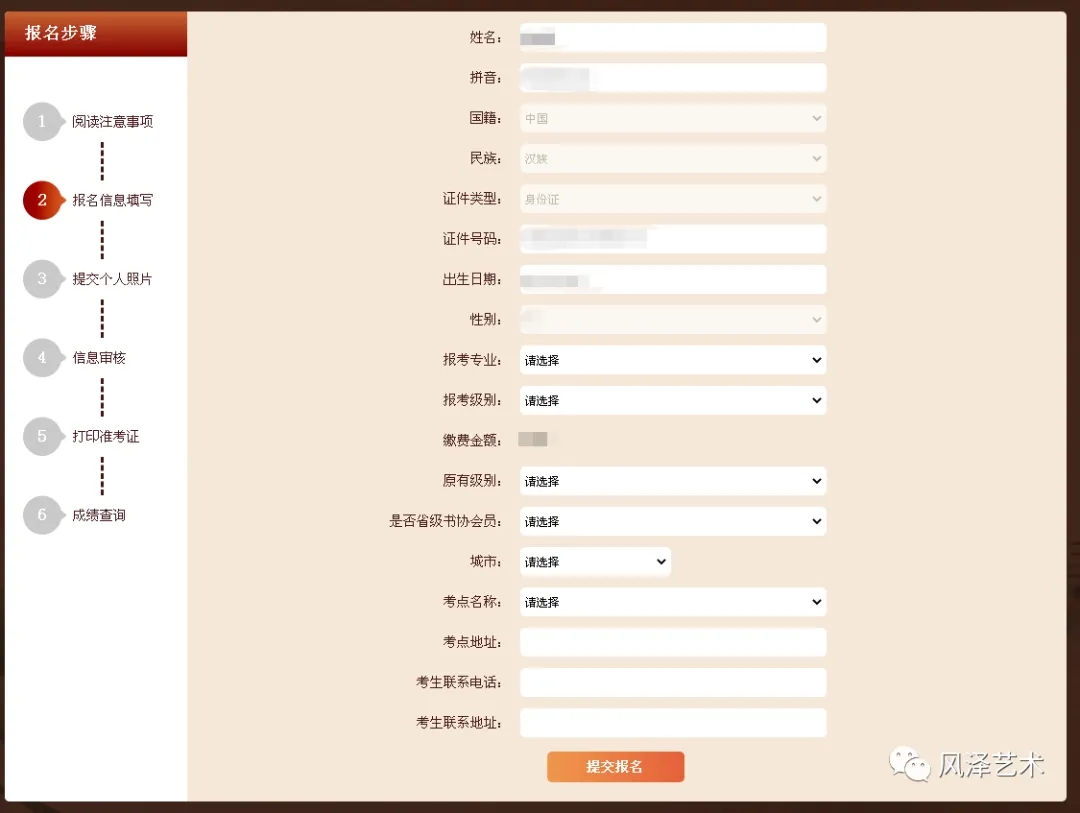 五、请仔细填写考试信息,提交报名。机构统一报名时考生联系地址填写:县/区+机构名称,机构老师可统一安排。