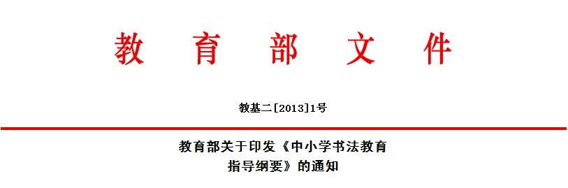 为贯彻《国家中长期教育改革和发展规划纲要(2010-2020年)》,适应新时期全面实施素质教育的要求,继承与弘扬中华民族优秀文化,我部组织专家研究制定了《中小学书法教育指导纲要》(以下简称《指导纲要》),经教育部基础教育课程教材专家工作委员会审议,现印发给你们,请于2013年春季开始执行。现将有关要求通知如下: