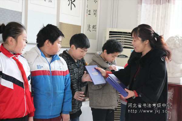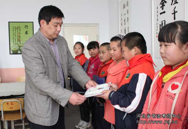 在石家庄市石纺路小学,校长李金花为参加考试的学生颁发等级证书。并鼓励学生继续努力练习书法,向更高级别挑战。