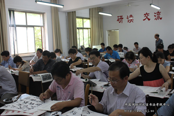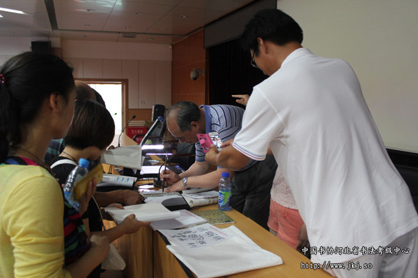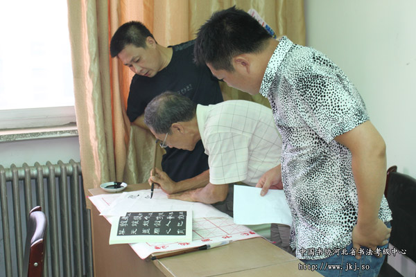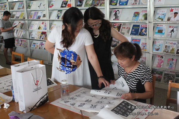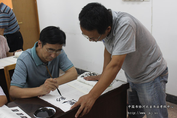 中国书协河北省书法考级中心主任曹晓林,秘书长冯欢鉴赏学员作品,并做指导