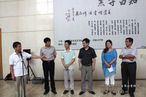 出席2013年河北省中小学骨干教师培训第二批结业仪式的领导嘉宾从左至右为石家庄市书协副主席兼秘书长魏兵然,河北师大书法教授杨春,中国书协河北省书法考级中心副主任王占军,中国书协河北省书法考级中心主任曹晓林,石家庄市老年书画研究会副会长郭少斌,由中国书协河北省书法考级中心执行主任姜贵增主持