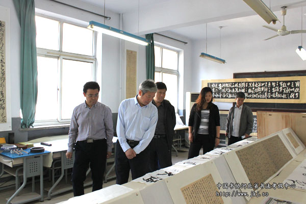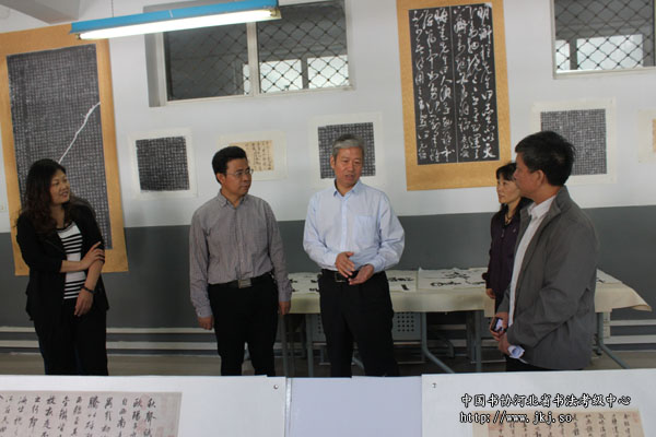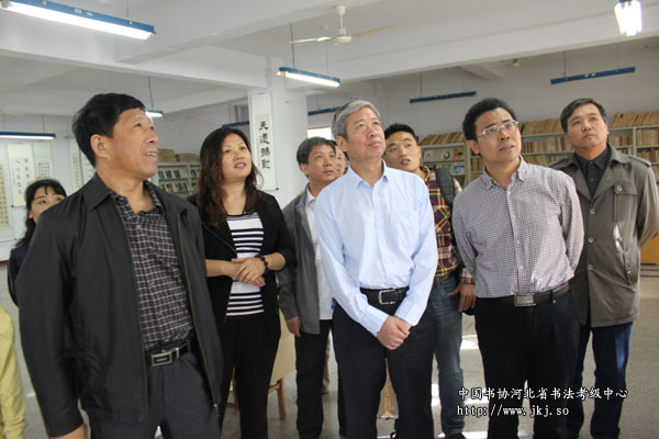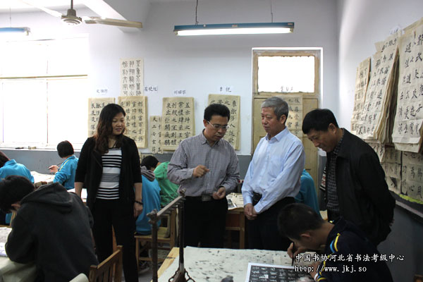 河北省教育厅副厅长张益禄、石家庄市教育局副局长张忠明、中国书协河北省书法考级中心主任曹晓林、石家庄市第三十八中校长解仲胥一起参观书法教室,观看学生练习书法