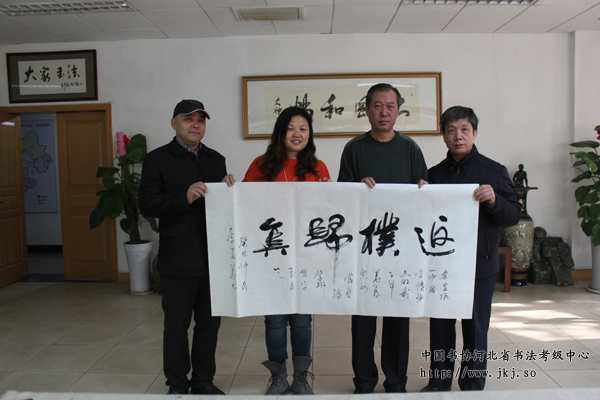 河北省文化厅副厅长李建华与中国书协河北省书法考级中心主任曹晓林、常务主任姜贵增在考级中心合影留念