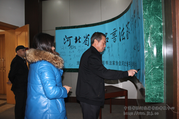 河北省文化厅副厅长李建华在中国书协河北省书法考级中心主办“辞旧迎新—河北省著名书法家作品展”签名留念