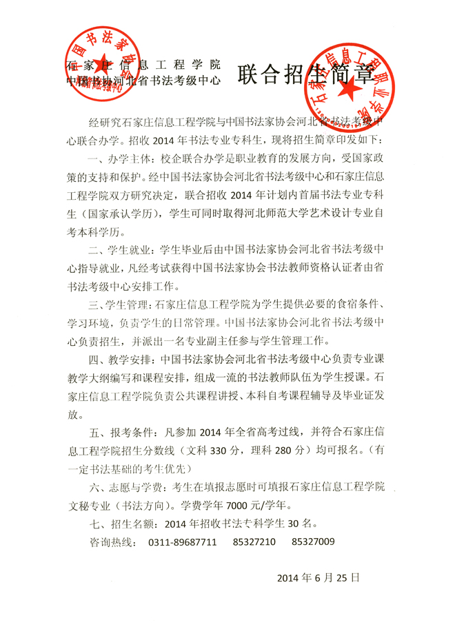 中国书协河北省书法考级中心与石家庄信息工程学院联合招生