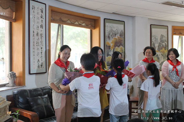 此次活动恰逢教师节前夕,学生为老师们献上鲜花。活动中,河北省书法考级中心书法教师和弦为孩子们上了一堂生动活泼的书法启蒙教育课。活动结束,学生们在老师的带领下,一起高呼“做好中国人,写好中国字,中国文化我传承”。