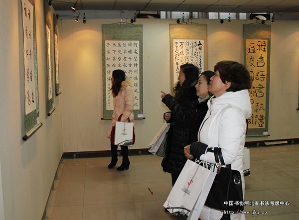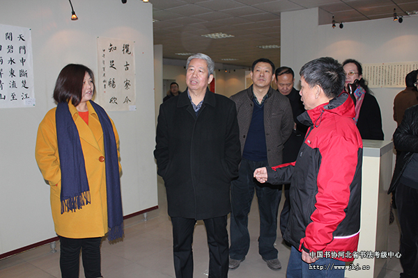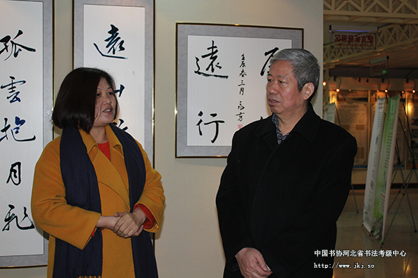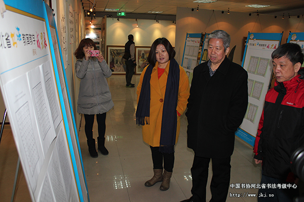 河北省教育厅副厅长张益禄在中国书协河北省书法考级中心主任曹晓林及常务主任姜贵增的陪同下观看软笔作品