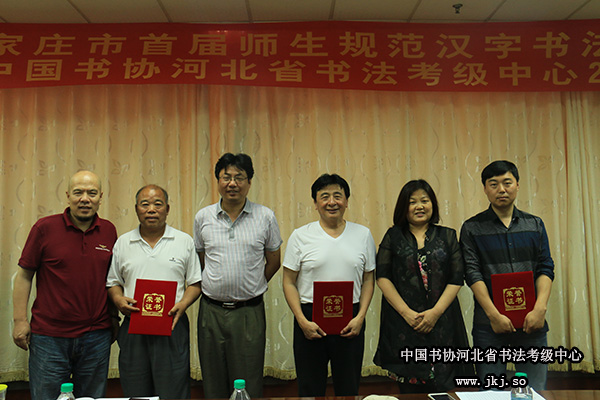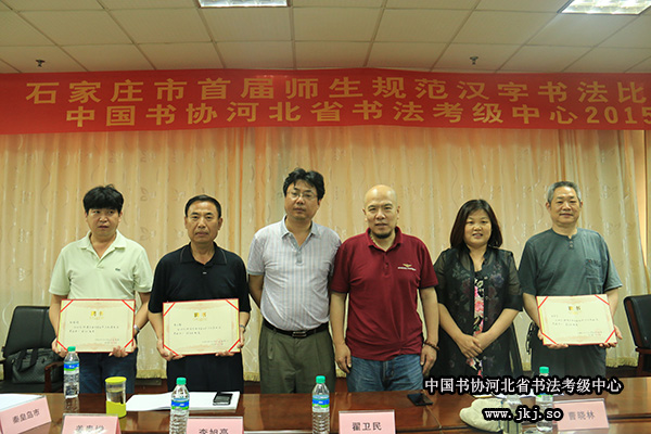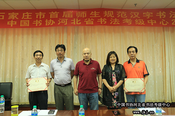 中国书协考级中心副主任严峻、中国书协考级中心考官翟卫民、中国书协河北省书法考级中心主任曹晓林为荣获2014年书法考级工作先进单位颁奖