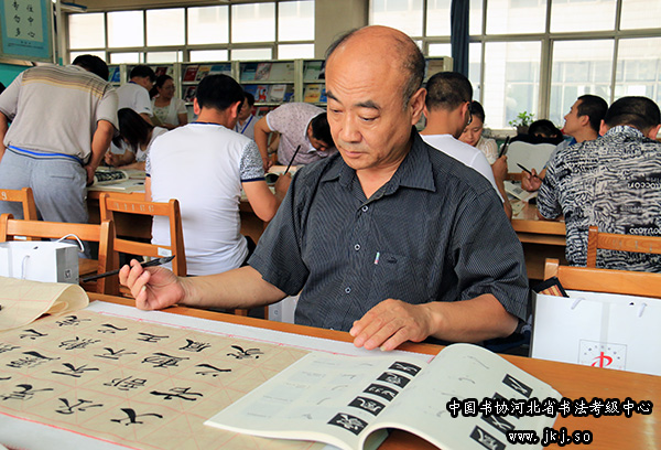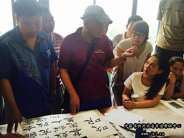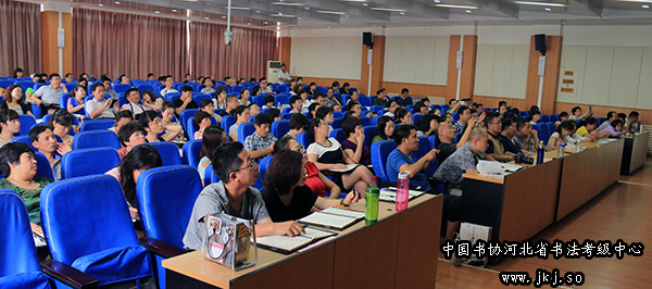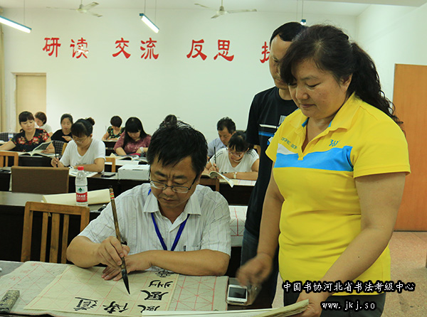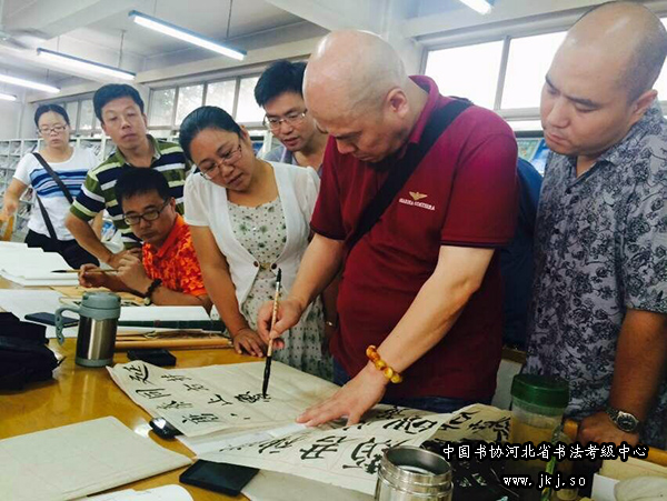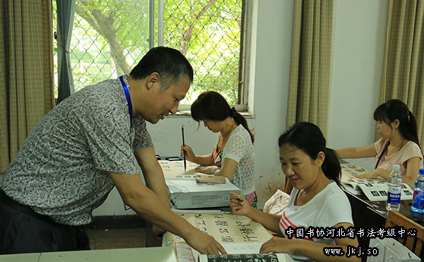7月18日,第二期全省中小学书法教师培训第四天,河北大学艺术学院院长、河北省书法家协会副主席刘宗超教授为参训学员教授隶书欣赏及其技法。下午学员分组练习时,中国书法家协会书法考级中心考官翟卫民亲临现场,为学员指导并做示范。