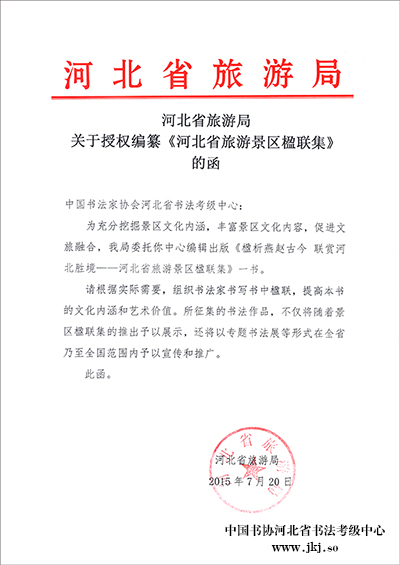 河北省旅游局委托我中心编辑出版《楹析燕赵古今联赏河北圣境——河北省旅游景区楹联集》一书,现已征集到新编楹联百余幅,所征集楹联经书法家书写后将要举办新编楹联书法展,并镌刻在相应景区内。