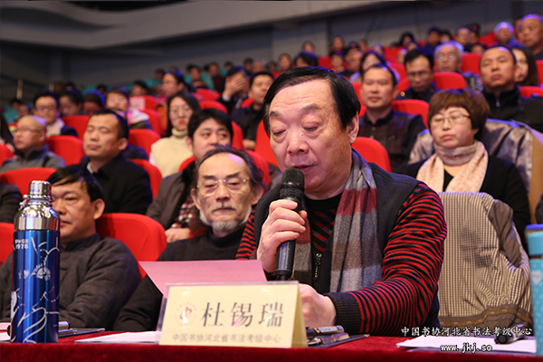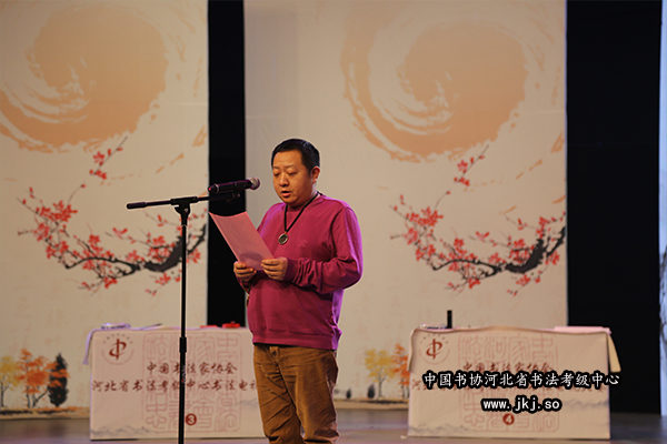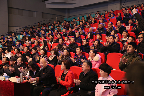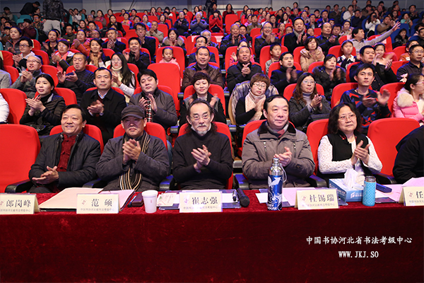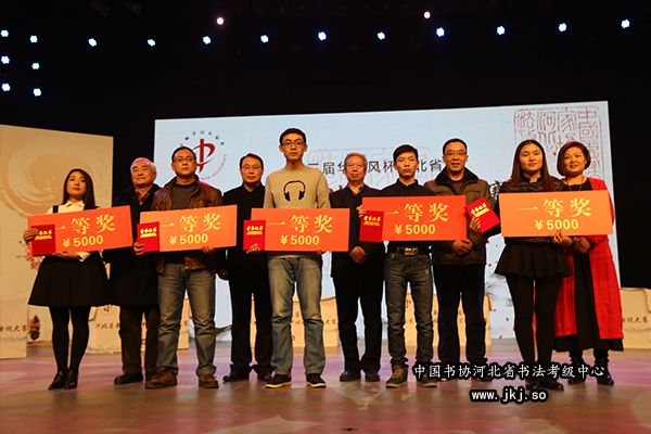 颁奖嘉宾由左至右依次为河北省委原副秘书长张国钧,北京电影学院美术学院院长张杰,河北省教育厅副厅长张益禄,石家庄市委宣传部副部长郭纯阳,中国书协河北省书法考级中心主任曹晓林与成人组一等奖获奖选手合影留念