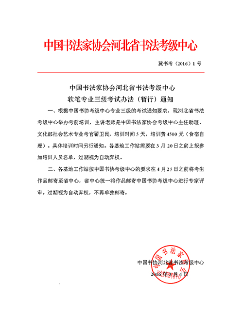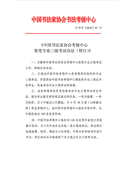根据中国书法家协会书法考级中心下发的《关于软笔专业三级考试办法(暂行)》的通知要求,现将河北省软笔专业三级考试办法(暂行)文件通知如下:
