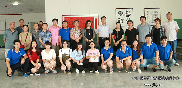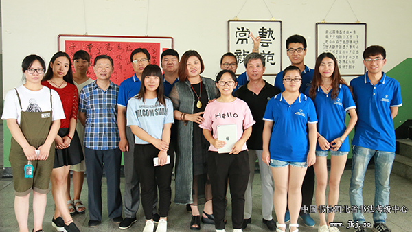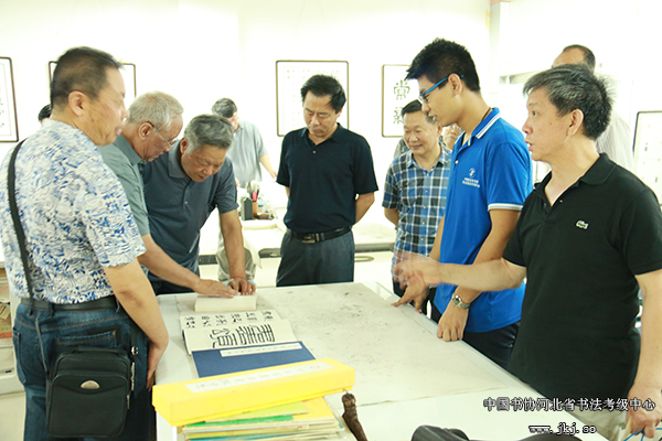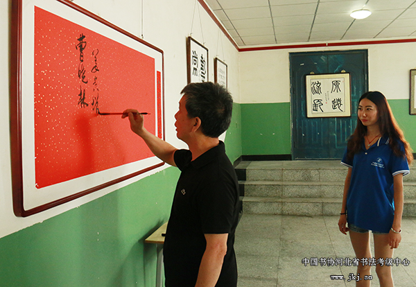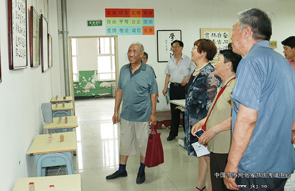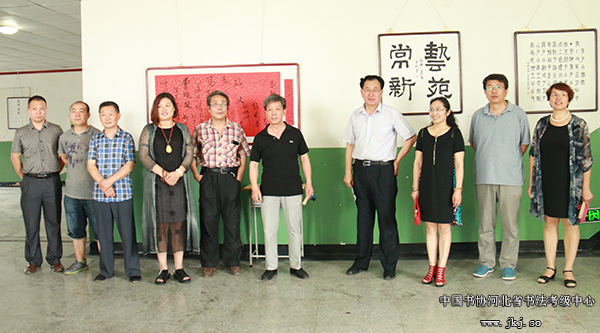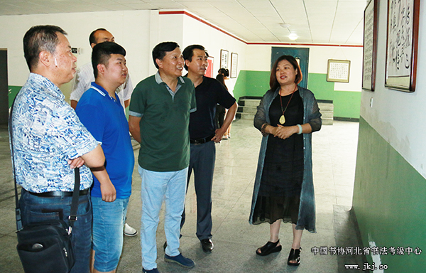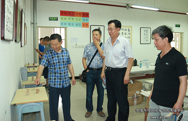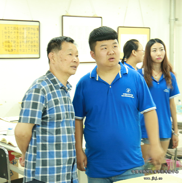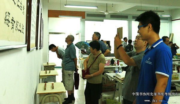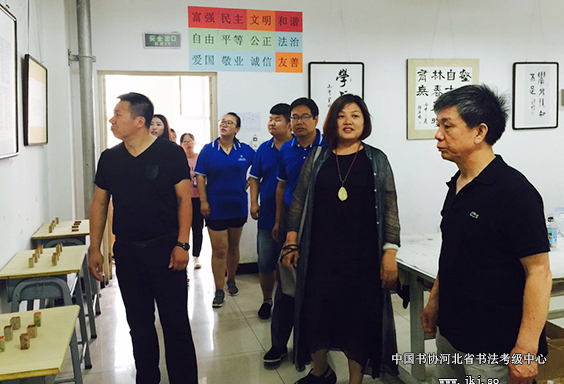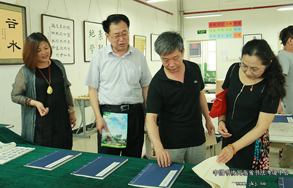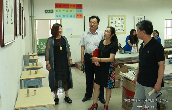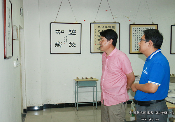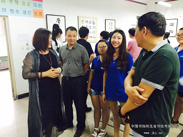 中国书协河北省书法考级中心主任曹晓林、常务主任姜贵增等在书法专业学生的陪同下观看结课展