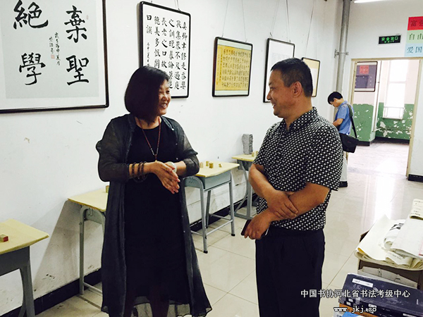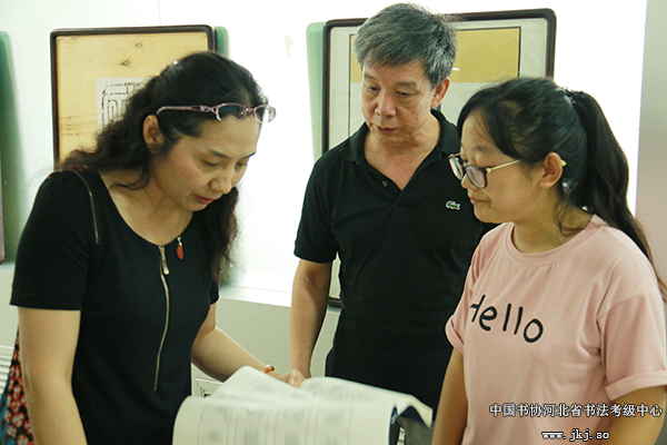 省书法考级中心主任曹晓林与观展老师就学生作品交流