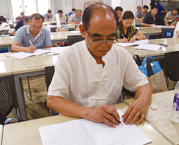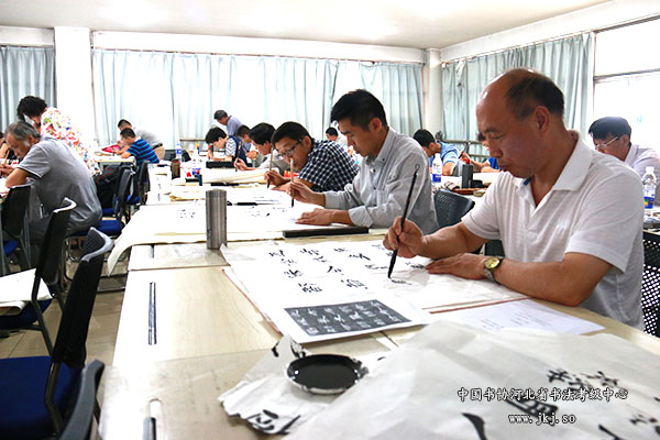 中国书法家协会考级中心主任助理、文化部社会艺术专业考官翟卫民在考级中心主任曹晓林的陪同下亲临考场观看考生考试。