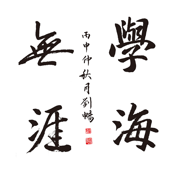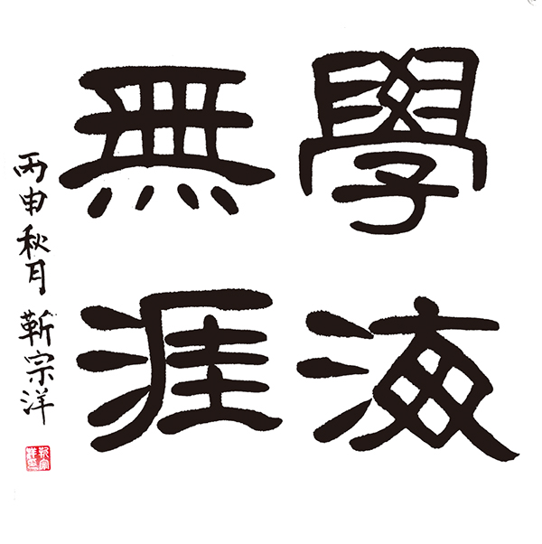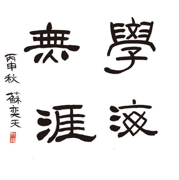 ▲苏奕天作品:无明显的取法,用笔笔笔中锋,写的遒劲自然,字的收放合理。难得的一点是线条的对比感比较好,如“海”字的三点水和右半部分的轻重对比,“學”字的收放较好。缺点是取法要明确点,总体四个字的协调要在好一些。获得二等奖。