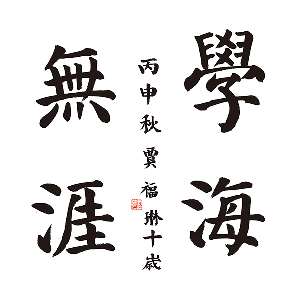 贾福琳的作品:取法颜真卿的《颜勤礼碑》,结构严谨,能够看出有扎实的基本功,用笔遒劲老练,能够较好的体现颜真卿宽博的体式。因此被评为一等奖。