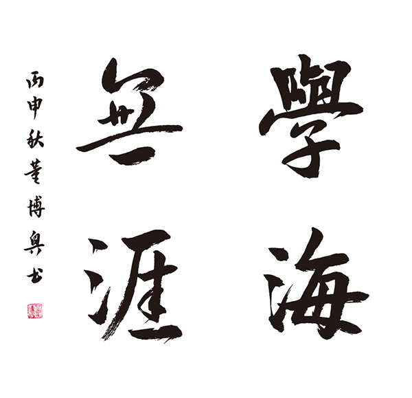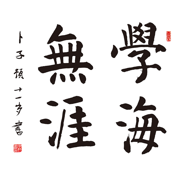 董博奥作品:取法王羲之行书,结构相对准确,用笔较为娴熟,能够较好的体现出行书动静结合的特点。缺点是用笔缺乏联系,如“無”“涯”二字内部笔画的动静结合缺少节奏感,“無”字三竖的连接方法欠推敲。因此评为二等奖作品。