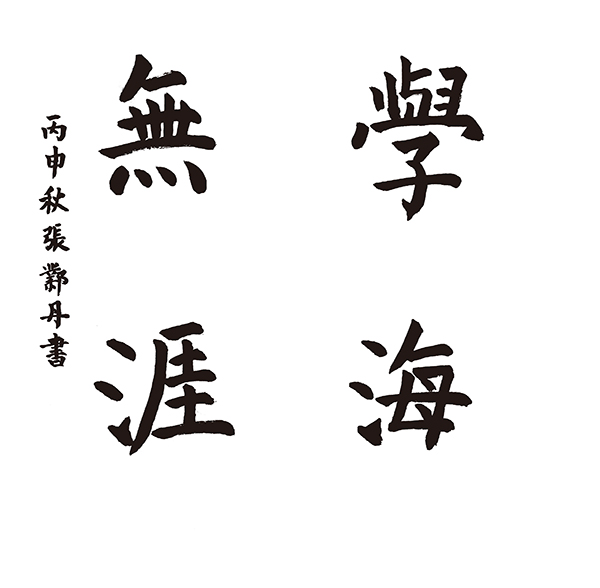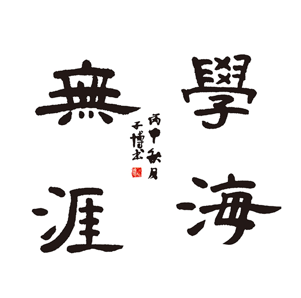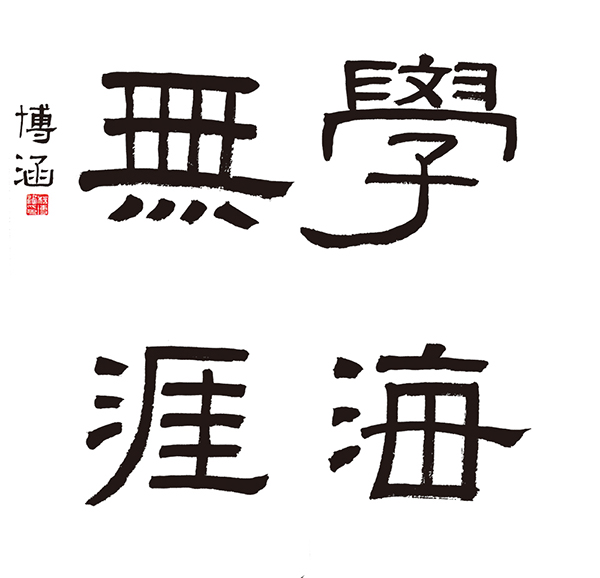 ▲   于子博作品:线条遒劲润朗,流动感较强,有些笔划写的很精彩,如“海”“無”的一波三折,“涯”字的撇写的非常到位,能够体现出经典书法的语言。缺点是四个字的取法不够统一,结构不太准确,如“無”字的四个竖写的不自然,太过错落,“涯”字的结构不太准确,“學”字的收放关系处理的不够到位。获得三等奖。