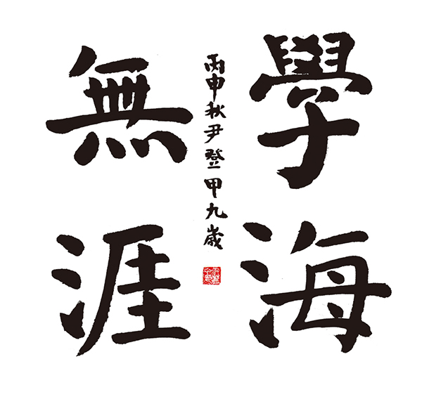 ▲   尹登甲作品:取法于颜真卿,线条陈厚有力,能够体现出对中锋用笔的理解较好,“無”字的四点底写的较好,有跳跃感。缺点是四个字的体式,结体上不太准确,收放不够适度,“無”“學”字稍显做作。获得三等奖。