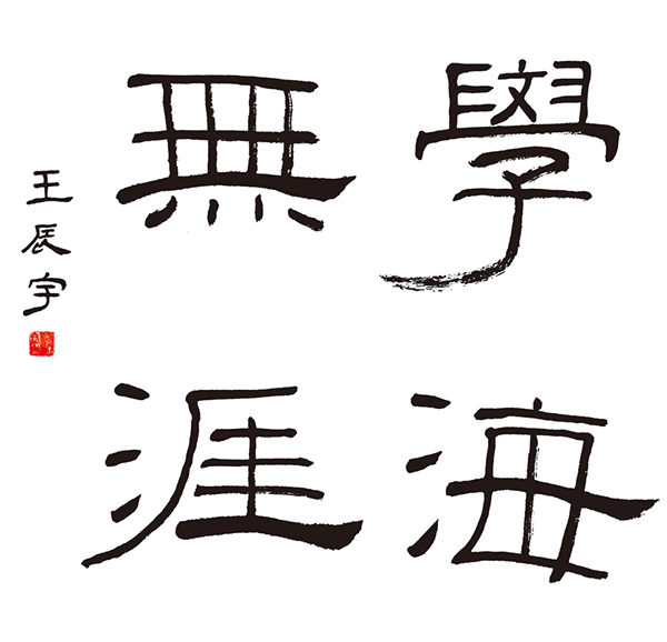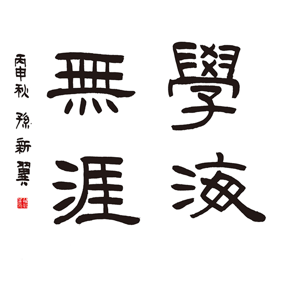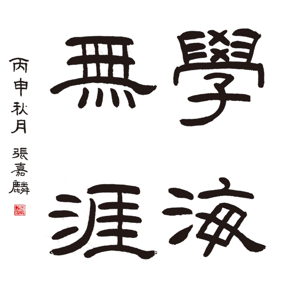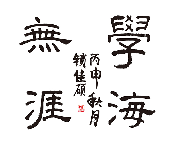 ▲锁佳硕作品:取法用笔比较厚重坚实,尤其是“海”字的横划一波三折写的非常精彩,“涯”的三点水,“學”的上半部分,处理的比较好,缺点是取法不够明确,缺乏对字的收放协调统一,“學”的下半部分有点楷书的倾向,四个字的味道不够统一,落款有点偏大。