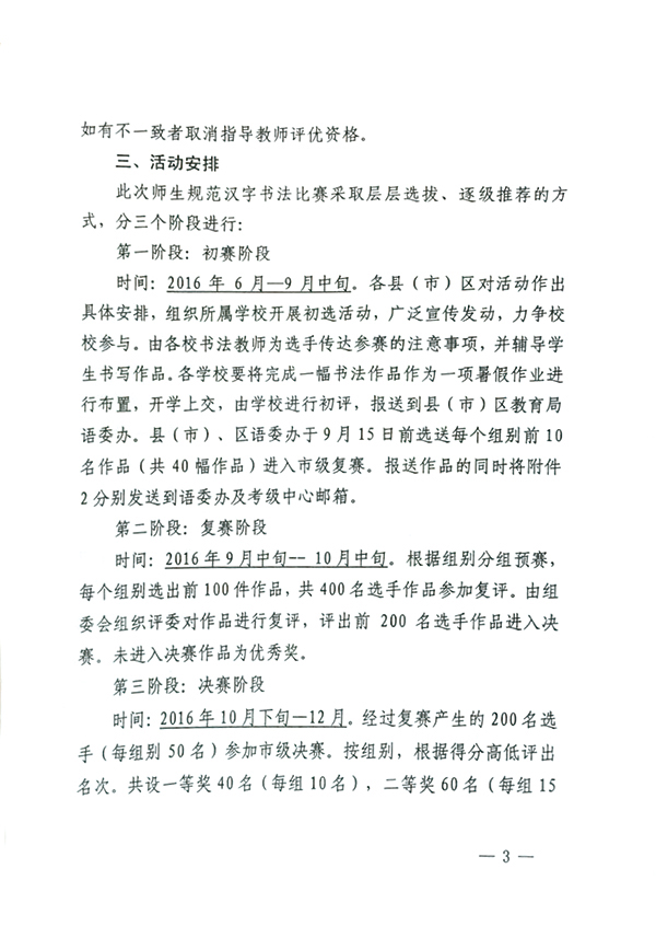 石家庄市第二届师生规范汉字书法比赛从6月开始征稿到10月底,经过层层选拔,逐级推荐,中国书法家协会河北省书法考级中心共收到参赛作品562幅。按照石语[2016]5号文件要求,我们对参赛作品进行了初评,每个组别评出100幅入围作品,在此基础上又组织评委对入围作品进行了复评,从中又选出前50幅参赛作品按小学、中学、大学生、教师组评出一、二、三等奖。其中小学组一等奖10名、二等奖15名、三等奖25名;中学组一等奖10名、二等奖15名、三等奖25名;教师组一等奖10名、二等奖15名、三等奖25名。大学组因作品数量少,评出一等奖1名,二等奖2名,三等奖4名。