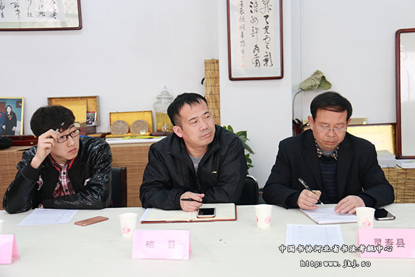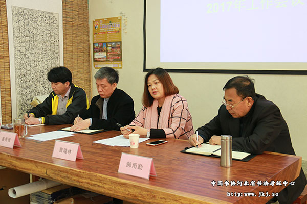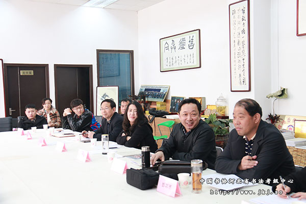 河北省书法考级中心主任曹晓林、常务主任姜贵增、副秘书长郝雨勤和杨敬科出席会议