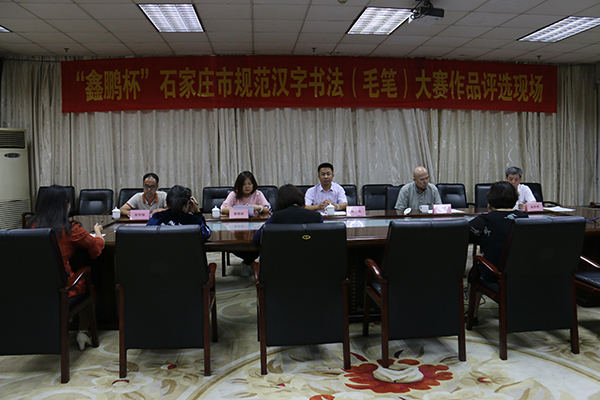 8月27日,由石家庄市教育局、市语委主办的“鑫鹏杯”石家庄市规范汉字书法(毛笔)大赛作品终评在河北省书法考级中心隆重举行。市教育局调研员车国利、市语委办主任姚龙、河北省书法考级中心主任曹晓林、中国书协会员、中国书协书法考级考官翟卫民、河北省书法考级中心常务主任姜贵增等领导、专家出席评选活动。