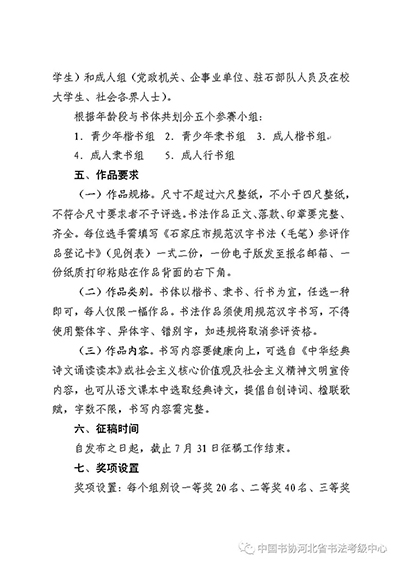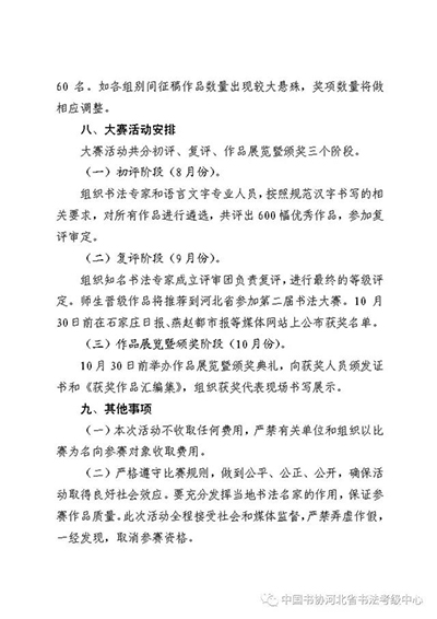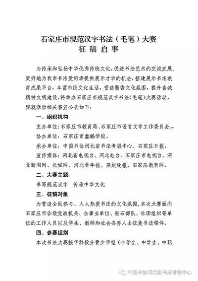 自2017年3月发布《“鑫鹏杯”石家庄市规范汉字书法(毛笔)大赛征稿启事》至启事规定截稿日期,共收到3216幅参评作品,青少年组2007幅,其中楷书1289幅、隶书702幅、行书16幅(注:《征稿启事》无设青少年行书组);成年组1209幅,其中楷书638幅、隶书241幅、行书330幅。评委老师们秉着对每一位参赛选手负责、对每一幅参评作品负责的态度,反复筛选,最终评选出349幅获奖作品。其中,青少年楷书组92幅(一等奖15幅、二等奖30幅、三等奖47幅),青少年隶书组66幅(一等奖10幅、二等奖20幅、三等奖36幅),成人楷书组130幅(一等奖25幅、二等奖40幅、三等奖65幅),成人隶书组36幅(一等奖5幅、二等奖9幅、三等奖22幅),成人行书组25幅(一等奖4幅、二等奖10幅、三等奖11幅)。
