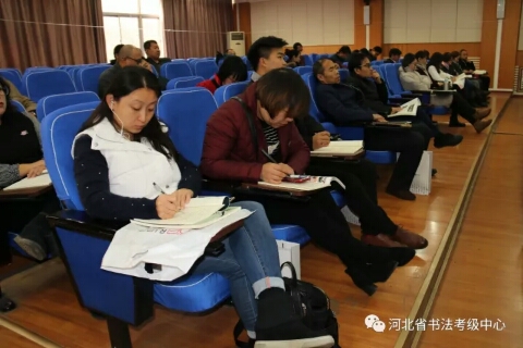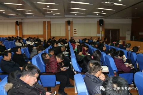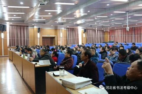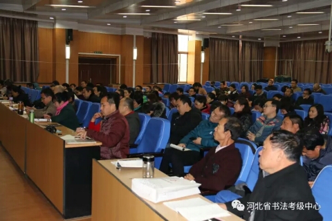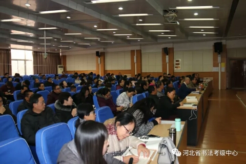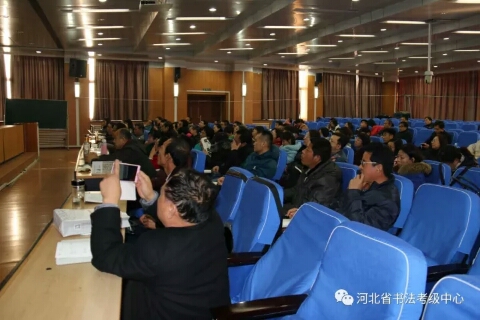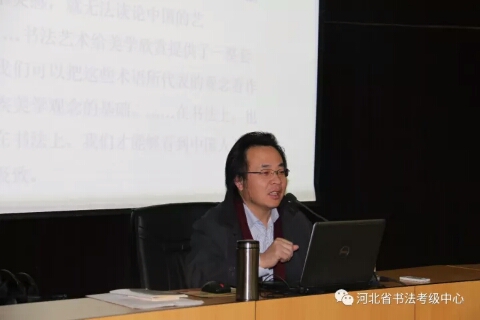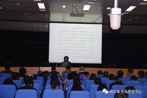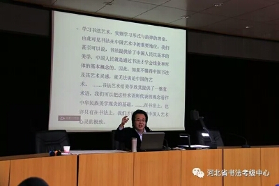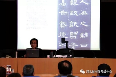 2017年第二期河北省中小学书法教师培训继续进行,河北大学艺术学院院长刘宗超为参训学员授课。上午,刘老师从书法艺术所具有的“矛盾律”、“到位”与“味道”等具体点入手,讲授了隶书的演变与发展,对汉隶、唐隶、清隶等不同时期的名家名作做了宏观定调。下午,刘老师具体地为大家分析不同时期隶书作品的特点,带领大家一一品味。然后结合篆书、行书等书体为大家讲解隶书的用笔、结字以及某篇布局的方法技巧,并为大家演示了隶书技法。