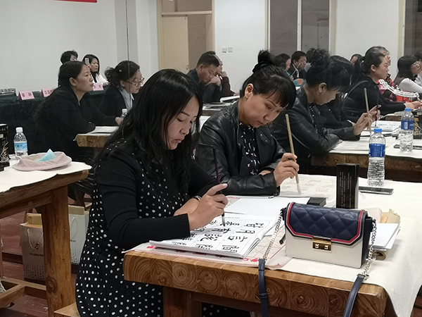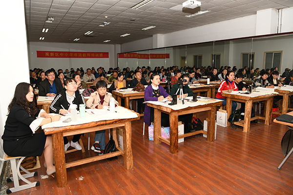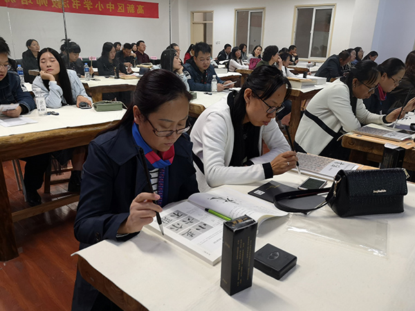 本次培训共有来自全区50多名中小学书法教师参加。这次培训利用寒假前三个月时间,每周利用半天时间,名师授课、教师辅导、临写碑帖、点评作业等形式进行。结束前要求每位学员创作完成一幅作品进行展览。开班第一天,请河北师范大学书法教师为学员讲授楷书形成与技法,并受到学员一致好评!