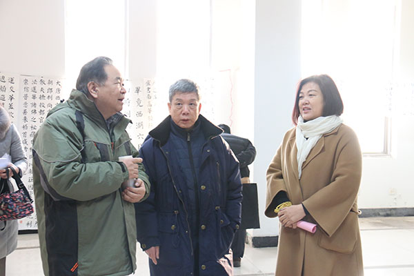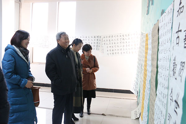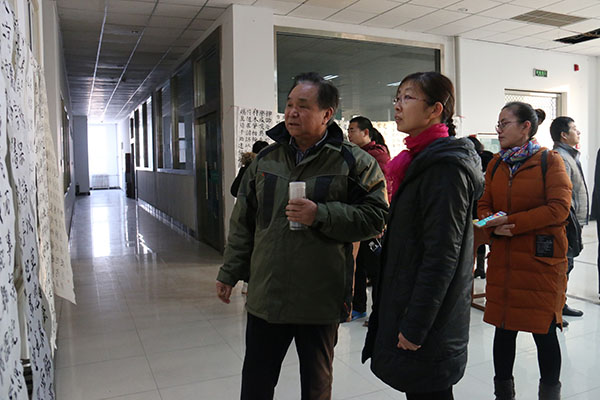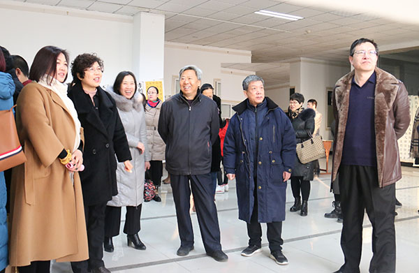 王树欣(右三)、李在兰(左二)、李忠(右一)、曹晓林(左一)、姜贵增(右二)、郎翠华(左三)观看学员作品